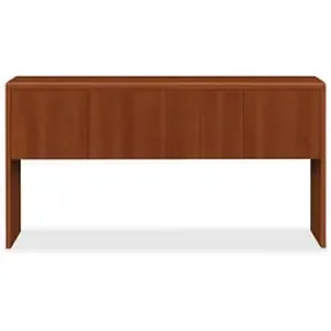 Stack-on storage adds overhead storage to L-shaped workstations formed from credenzas or returns in the HON 10700 Series Laminate Wood Desk Collection. That collection offers an upscale contemporary design, elegant lines, stylish accent details, durable laminate surfaces and quality construction. Premium, multilayer, high-pressure, Cognac laminate surface resists water, scratches and most solvents. Hardwood accent trim is produced using a multistep finishing process and adds an elegant touch appropriate for upper-management offices. Inside storage includes two 34-3/4" wide x 12-7/8" deep x 12" high compartments. Stack-on storage is also equipped with self-closing, adjustable hinged doors and valance to hide a task light (sold separately). Clearance between storage and your worksurface is 19-3/4". Attach to the desk, peninsula or corner unit via double-sided tape and to the return through the grommet hole.