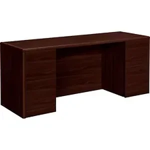 Credenza with kneespace is part of HON 10700 Series Laminate Wood Desks with worksurfaces and outer end panels clad in multilayer, high-pressure laminate that resists water, abrasions and most solvents. Rich, mahogany finish covers a durable, 1-1/8" thick, solid-core, high-performance particleboard that resists warping. Hardwood trim is stained to match the top-grade, stain-resistant laminate. User-friendly waterfall edges offer a gentle, curved profile. Two full pedestals maximize filing storage space with a file/file configuration. All drawers lock. Five-sided drawer construction allows easy drawer alignment. Hangrails in all file drawers offer side-to-side letter and legal filing and front-to-back letter filing. Credenza also features double-radius edge detail, 3-1/2" recessed modesty panel with one passthrough grommet in the top center, and two worksurface grommets to route and hide cords. Adjustable hex leveling glides allow the credenza to be easily leveled without lifting.