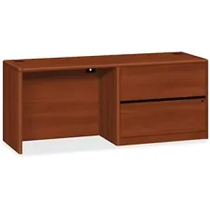 Right-pedestal credenza with lateral file is part of HON 10700 Series Wood Laminate Furniture with an upscale contemporary design, stylish accent details, durable laminate surfaces and quality construction. Premium, multilayer, high-pressure, Cognac laminate surface resists water, scratches and most solvents. Durable, 1-1/8" solid core, high-performance particleboard withstands frequent moving and handling. Design also features a full-height modesty panel, user-friendly waterfall edges and rounded corners. Credenza offers more than just the usual pedestal. This 36" lateral file pedestal includes a core-removable lock and two lateral file drawers. Mechanical interlock inhibits the extension of more than one drawer at a time. Five-sided construction allows easy drawer alignment. Cord management includes two grommets in the desktop and one-cord, passthrough grommet in top center of modesty panel for routing and hiding wires and cables.