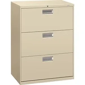 Three-drawer lateral file offers exceptional construction with double-walled base construction for maximum rigidity. Baked enamel finish over rust-inhibiting, phosphate pretreatment adds more durability. Telescoping, ball-bearing suspension delivers remarkably smooth drawer operation. Drawers accommodate letter-size or legal-size folders from side-to-side with included adjustable hangrails. Drawers are flush at the top and sides and feature aluminum recessed drawer pulls and drawer-extension restraint. Mechanical interlock allows only one drawer to open at a time. 30" wide lateral file also offers four adjustable leveling guides for stabilizing; HON One Key interchangeable, core-removable lock; and reinforced case steel construction. Lock mechanism secures both sides of drawers.