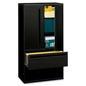 36" wide lateral file with adjustable shelf storage matches the same height as HON 700 Series five-drawer lateral files. Bottom two openings hold files while the remainder of case offers storage shelves with two hinged doors. Inside height of storage case measures 36-1/4". The storage area includes two shelves that are adjustable in 2" increments. Bottom shelves accept two rows of three-ring binders. Opening at top shelf measures 10-1/4". Door pulls match lateral file drawer pulls.