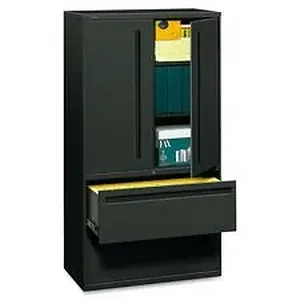 36" wide lateral file with adjustable shelf storage matches the same height as HON 700 Series five-drawer lateral files. Bottom two openings hold files while the remainder of case offers storage shelves with two hinged doors. Inside height of storage case measures 36-1/4". The storage area includes two shelves that are adjustable in 2" increments. Bottom shelves accept two rows of three-ring binders. Opening at top shelf measures 10-1/4". Door pulls match lateral file drawer pulls.