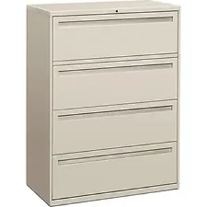 Locking, 42" wide lateral file offers secure file storage in its four fixed front drawers. Each drawer includes two adjustable hangrails for side-to-side filing of letter-size or legal-size folders. Three-part, telescoping, steel ball-bearing suspension delivers smooth opening and closing. Mechanical interlock allows only one drawer to open at a time. Design also features contemporary, full-face, integral drawer pulls; a core-removable lock; and 19-1/4" case depth. Reinforced case construction with flush top and sides has a baked enamel finish over rust-inhibiting phosphate pre-treatment. Light gray lateral file is certified by SCS to be in compliance with specific, indoor, air-quality emission requirements and meets or exceeds applicable ANSI/BIFMA standards.