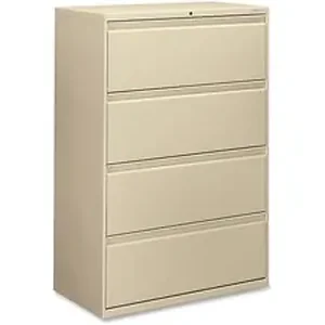 Four-drawer lateral file offers clean lines, reinforced case construction, 36" width, dual side locks for security, and full-width, designer-style handles. Baked enamel finish over rust-inhibiting, phosphate pretreatment adds more durability. Three-part, telescoping, ball-bearing suspension delivers smooth drawer operation. Drawers accommodate letter-size or legal-size folders from side-to-side with included adjustable hangrails. Drawers are flush at the top and sides and feature drawer-extension restraint. Mechanical interlock allows only one drawer to open at a time. Putty-colored lateral file also offers four adjustable leveling guides for stabilizing and HON One Key interchangeable, core-removable lock. Lock mechanism secures both sides of drawers.