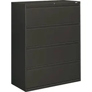 Four-drawer lateral file offers clean lines, reinforced case construction, 42" width, dual side locks for security, and full-width, designer-style handles. Baked enamel finish over rust-inhibiting, phosphate pretreatment adds more durability. Three-part, telescoping, ball-bearing suspension delivers smooth drawer operation. Drawers accommodate letter-size or legal-size folders from side-to-side with included adjustable hangrails. Drawers are flush at the top and sides and feature drawer-extension restraint. Mechanical interlock allows only one drawer to open at a time. Charcoal lateral file also offers four adjustable leveling guides for stabilizing and HON One Key interchangeable, core-removable lock. Lock mechanism secures both sides of drawers.