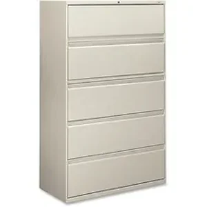 Five-drawer lateral file offers clean lines, reinforced case construction, dual side locks for security, and full-width, designer-style handles. Baked enamel finish over rust-inhibiting, phosphate pretreatment adds more durability. Three-part, telescoping, ball-bearing suspension delivers smooth drawer operation. Light gray lateral file includes four fixed drawers, and the top drawer is a roll-out shelf with a receding flipper door. Ideal for binders, end-tab files, standing files or supplies. Drawers accommodate letter-size or legal-size folders from side-to-side with included adjustable hangrails. Drawers are flush at the top and sides and feature drawer-extension restraint. Mechanical interlock allows only one drawer to open at a time. Lateral file also offers four adjustable leveling guides for stabilizing and HON One Key interchangeable, core-removable lock. Lock mechanism secures both sides of drawers.