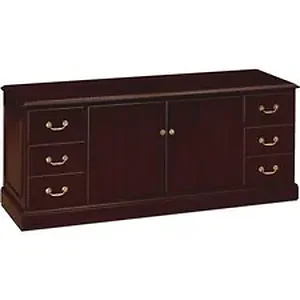 Credenza features elegant detailing that includes antique brass drawer pulls and raised decorative molding. Top is abrasion-resistant and stain-resistant, high-gloss, high-pressure laminate over durable, 1-1/8" thick, solid-core, high-density particleboard that resists warping. Five-sided construction allows easy drawer alignment or replacement of drawer fronts. Credenza offers interchangeable, core-removable lock to make rekeying quick and easy. Adjustable hex leveling glides easily level out without lifting the desk. Glides have a 3/4" adjustable range. Furniture is certified by SCS to be in compliance with specific, indoor, air-quality emission requirements and meets or exceeds applicable ANSI/BIFMA standards.
