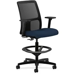 Ignition Series Stool gives you control over your domain with the ability to either sit or stand in an adjustable-height workstation, or bring people around standing-height collaborative tables. Make it personal with a contoured, four-way stretch mesh back; arms that adjust in height and width; and adjustable footring. Mesh and frame are black while fabric upholstery on seat is navy. Five-star base offers casters for easy movement. Functions include pneumatic seat-height adjustment, back-height adjustment and 360-degree swivel. Stool supports up to 300 lb. and meets/exceeds applicable ANSI/BIFMA standards.