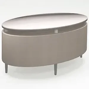 Complete your waiting area with this Eve Oval Coffee Table. The sleek lines of the Eve Collection provide a contemporary solution to reception areas, waiting rooms, open-plan team areas, lobbies and training rooms. The Eve Occasional Table provides a durable yet minimalistic surface for laptop, computers, tablets and reading materials. Floating, 1" thick top features thermally fused, Shoreline laminate that withstands years of use. The neutral Shoreline finish is fade-resistant, gray stain with a medium-gloss lacquer top coat. Upholstered sides over the hardwood frame offer an elegant accent and more separation between waiting guests. Anodized, brushed aluminum, 8" cylinder legs include adjustable leveling glides so the table offers reliable support for guests.