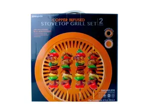 For all your barbeque craving, this Copper Infused Stovetop Grill Set by Simple & Co is great for everyday use. This smokeless, lightweight and non-stick grill need no oil or butter to cook. Simply add water to drip tray for grease collection. This barbeque plate can be placed on a portable burner. Stovetop, ceramic top, and it is dishwasher safe. It's aluminum and copper material is ideal for everyday use. It is 2" x 10" in size and has an inner 9.65" diameter and outer 12.60" diameter. Comes packaged in a 12.75" x 12.50" x 2" hanging box.