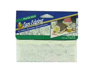 Add a touch of vintage charm to your projects with this Peel and Stick Lace Trim. Perfect for shelves, decorations, and various craft applications, this beautiful white lace features a scalloped edge that enhances its decorative appeal.