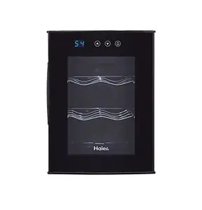 This Haier 6 bottle smoked-Curved glass door wine cooler, offers digital touch screen temp control. Protects the taste of reds and whites, virtually silent. Thermoelectric, energy-efficient, CFC-free wine cooler. ETL approved. 6-bottle capacity. Adjustable temperature range: 46-66F.smoked-glass thermopane door with recessed handle and Black trim. 2 Pull-out Chrome shelves. Soft Interior LED lighting. Black