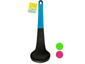 Introducing the Durable Kitchen Ladle with Ergonomic Grip, designed for effortless mixing and serving of soups, gravies, and more. This ladle is crafted from high-quality plastic, featuring a sleek black end that adds a touch of elegance to your kitchen tools. The anti-slip colored handle ensures a comfortable and secure grip while you cook. Measuring approximately 12 inches long, it is perfect for reaching into deep pots and serving dishes. Available in assorted colors, making it a stylish addition to your kitchen!