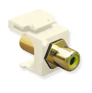 This white RCA female to female keystone jack features a vibrant yellow insert, making it easy to identify in your home theater or entertainment setup.