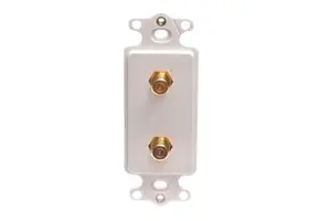 The Decora F-Type Insert in White is designed for seamless audio and video connections. It features dual F connectors with gold plating for enhanced performance and signal quality, reducing noise interference. This insert is compatible with both RG6 and RG59 coaxial cables, making it versatile for various installations.