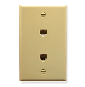 The Ivory Wall Plate features a single gang, two-port design that integrates dual 6P6C jacks for voice connectivity. It is configured to fit a standard single gang outlet box, making installation straightforward. This wall plate is constructed as a one-piece unit that requires no assembly, allowing for efficient setup while saving time and resources by utilizing pre-kitted common faceplates with modular connectors.