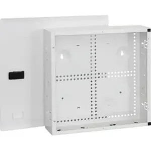 - 14? Residential Structured Cabling Enclosure- Designed with steel construction, white powder coated, lightweight and sturdy- Designed to serve as the central distribution point for voice, data, video, audio, and security services for smaller residential structured wiring systems- Allows for internal modules to be mounted horizontally or vertically facilitating easier layout and wiring of the system, while providing for optimum cable management- Integrated snap-in module system enables users to quickly insert or move the internal modules- Supports up to 4 ICCMSCMPR1 or ICCMSCMPR2 Cable Management Rings for organizing and routing cables- Includes 4 top, 3 bottom, 4 rear, and 2 side knockouts for routing cables and 4 cable tie points- Includes a knockout for an optional AC power outlet (not included) to provide power distribution- Fits between 16? wall studs with 10 internal module mounting spaces or can be wall mounted- Designed with a door latch and an optional door lock knockout- Hinged door and NET MEDIA CENTER insert are reversible for opening from left or right- Accommodates all of ICRESXXXXX residential modules- Used with optional accessories including ICRDSDCAC2 distribution center rubber grommets, ICRESDCAC3 distribution center plastic grommets, and ICRDSDC2LK distribution center door lock- Flush mounted door overlaps ?" to conceal any uneven drywall cuts around the enclosure- UL listed