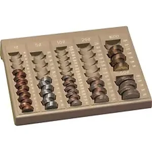 This handy One-Piece Plastic Tray conveniently takes all the counting out of counting your change. It has separate pockets for pennies, nickels, dimes, quarters, halves and dollars that each hold exactly five coins, making precise coin count easy. Compartments are staggered for easy pickup. Rows are marked with coin value for quick counting. Rubberized feet provide a nonslip base.