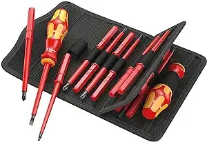 Introducing the Wera Insulated Screwdriver Set, a comprehensive 18-piece toolkit designed for professionals dealing with electrical applications. Each screwdriver is insulated to provide maximum safety, ensuring that you can work confidently with live wires.