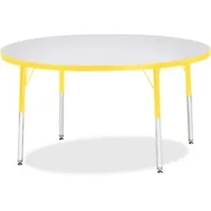 Round activity table for adults is perfectly sized to let you work comfortably. Laminate is durable and features an easy-to-clean surface. TRUEdge is permanently thermo-fused to the edges to prevent chipping. Extra-safe, dual-screw steel legs allow you to easily adjust the height of the table. Powder-coated, adjustable legs can be repositioned in 1" increments to provide maximum comfort. Leg guides reduce squeaks, prevent snags and eliminate rusting.