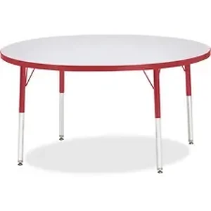 Round activity table for adults is perfectly sized to let you work comfortably. Laminate is durable and features an easy-to-clean surface. TRUEdge is permanently thermo-fused to the edges to prevent chipping. Extra-safe, dual-screw steel legs allow you to easily adjust the height of the table. Powder-coated, adjustable legs can be repositioned in 1" increments to provide maximum comfort. Leg guides reduce squeaks, prevent snags and eliminate rusting.