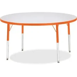 Round activity table for adults is perfectly sized to let you work comfortably. Laminate is durable and features an easy-to-clean surface. TRUEdge is permanently thermo-fused to the edges to prevent chipping. Extra-safe, dual-screw steel legs allow you to easily adjust the height of the table. Powder-coated, adjustable legs can be repositioned in 1" increments to provide maximum comfort. Leg guides reduce squeaks, prevent snags and eliminate rusting.