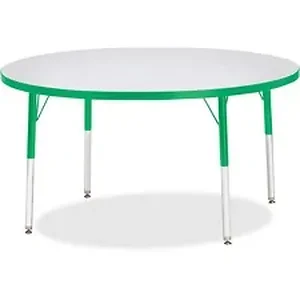 Round activity table for adults is perfectly sized to let you work comfortably. Laminate is durable and features an easy-to-clean surface. TRUEdge is permanently thermo-fused to the edges to prevent chipping. Extra-safe, dual-screw steel legs allow you to easily adjust the height of the table. Powder-coated, adjustable legs can be repositioned in 1" increments to provide maximum comfort. Leg guides reduce squeaks, prevent snags and eliminate rusting.