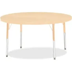 Round activity table for adults is perfectly sized to let you work comfortably. Laminate is durable and features an easy-to-clean surface. TRUEdge is permanently thermo-fused to the edges to prevent chipping. Extra-safe, dual-screw steel legs allow you to easily adjust the height of the table. Powder-coated, adjustable legs can be repositioned in 1" increments to provide maximum comfort. Leg guides reduce squeaks, prevent snags and eliminate rusting.