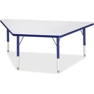 Trapezoid-shaped activity table is perfect for toddlers. Multiple trapezoid tables can be conveniently arranged in an assortment of configurations to accommodate any space. Durable laminate features an easy-to-clean surface. TRUEdge is permanently thermo-fused to the edges to prevent chipping. Extra-safe, dual-screw steel legs allow you to easily adjust the height of the table. Powder-coated, adjustable legs can be repositioned in 1" increments to provide maximum comfort for children. Leg guides reduce squeaks, prevent snags and eliminate rusting.