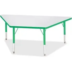 Trapezoid-shaped activity table is perfect for toddlers. Multiple trapezoid tables can be conveniently arranged in an assortment of configurations to accommodate any space. Durable laminate features an easy-to-clean surface. TRUEdge is permanently thermo-fused to the edges to prevent chipping. Extra-safe, dual-screw steel legs allow you to easily adjust the height of the table. Powder-coated, adjustable legs can be repositioned in 1" increments to provide maximum comfort for children. Leg guides reduce squeaks, prevent snags and eliminate rusting.