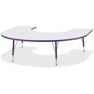 Horseshoe-shaped activity table lets people conveniently gather around an educator. Durable laminate features an easy-to-clean surface. TRUEdge is permanently thermo-fused to the edges to prevent chipping. Extra-safe, dual-screw steel legs allow you to easily adjust the height of the table. Powder-coated, adjustable legs can be repositioned in 1" increments to provide maximum comfort for children. Leg guides reduce squeaks, prevent snags and eliminate rusting.