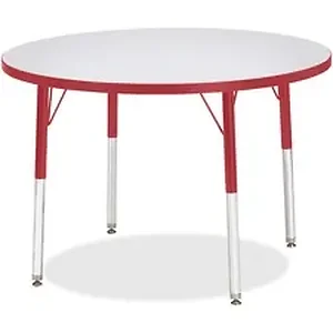 Round activity table for adults is perfectly sized to let you work comfortably. Laminate is durable and features an easy-to-clean surface. TRUEdge is permanently thermo-fused to the edges to prevent chipping. Extra-safe, dual-screw steel legs allow you to easily adjust the height of the table. Powder-coated, adjustable legs can be repositioned in 1" increments to provide maximum comfort. Leg guides reduce squeaks, prevent snags and eliminate rusting.