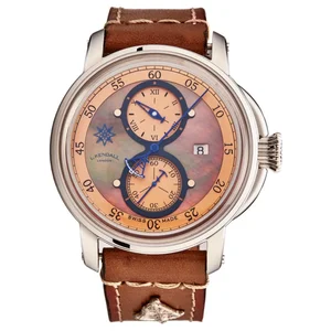 Larcum Kendall K5-002 Men's 'K5' Brown Mother of Pearl Dial Brown Leather Strap Date Swiss Automatic Watch Larcum Kendall K5-002 Men's 'K5' Brown Mother of Pearl Dial Brown Leather Strap Date Swiss Automatic Watch features a stainless steel 46mm case, a brown dial, and a sapphire crystal. The 23mm calfskin band is fitted with a buckle clasp. This wrist watch is powered by automatic movement. This watch has a water resistance of up to 330 feet/100 meters, suitable for short periods of recreational swimming. Features: Brand: Larcum Kendall Model number: K5-002 Case Shape: Round Dial window material type: Sapphire Display Type: Analog Clasp: Buckle Clasp Case Material: Stainless steel Case diameter: 46 millimeters Case Thickness: 16 millimeters Band Material: Calfkin Band length: 8 inches Band width: 23 millimeters Band Color: Brown Dial Color: Brown Bezel Material: Stainless Steel Bezel Function: Fixed Movement: Automatic Water-resistant depth: 100 meters UPC: Larcum Kendall K5-002 MSRP: $ 7,900