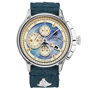 Larcum Kendall K8-003B Men's 'K8' Blue Mother of Pearl Dial Blue Suede Strap Chronograph Automatic Watch Larcum Kendall K8-003B Men's 'K8' Blue Mother of Pearl Dial Blue Suede Strap Chronograph Automatic Watch features a stainless steel 47mm case, a blue mother of pearl dial, and a sapphire crystal. The 23mm suede band is fitted with a buckle clasp. This wrist watch is powered by automatic movement. This watch has a water resistance of up to 330 feet/100 meters, suitable for short periods of recreational swimming. Features: Brand: Larcum Kendall Model number: K8-003B Case Shape: Round Dial window material type: Sapphire Display Type: Analog Clasp: Tang Clasp Case Material: Stainless steel Case diameter: 47 millimeters Case Thickness: 17.5 millimeters Band Material: Suede Band length: 8 inches Band width: 23 millimeters Band Color: Blue Dial Color: Blue Mother of Pearl Bezel Material: Stainless Steel Bezel Function: Fixed Movement: Automatic Special Features: Chronograph Water-resistant depth: 100 meters UPC: Larcum Kendall K8-003B MSRP: $ 6,900
