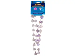 Girls will adore this enchanting Iridescent Heart Beads Necklace and Rings Set. This delightful set includes a 23.5" necklace adorned with vibrant, transparent heart beads complemented by small round beads, perfectly paired with two charming faceted flower-shaped rings in pink and purple.