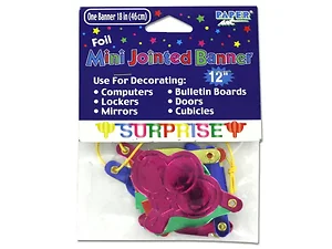 This vibrant mini jointed banner measures 22 inches in total length when hung, making it a perfect addition to your celebrations. The word 'Surprise' is crafted from cardstock and features stunning metallic colors including blue, gold, green, pink, and red. Ideal for decorating various spaces such as computers, lockers, mirrors, bulletin boards, doors, and cubicles.