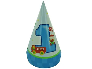 Make your little boy's first birthday memorable with these fun fire truck-themed hats! Each hat features a vibrant design that showcases a big "1st" alongside a cheerful little boy and a colorful fire truck, all framed by a bright blue and green border.