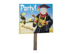 Planning a luau party for your graduate? This double-sided yard sign features a graduate in a cap and gown adorned with leis and holding a ukulele. It's designed with a fun 'Aloha' sign accompanied by a cheerful toucan. The graduate's face cutout is perfect for photo opportunities, measuring approximately 3 1/8" x 2 3/4". Set against a vibrant island background, this sign creates an ideal party ambiance.
