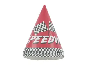 Add a touch of excitement to your speedway-themed party with these vibrant party hats. Crafted from durable paper, each hat features a fun design of iconic black and white racing flags along with the bold word 'Speedway'. Equipped with an elastic string, these hats ensure a secure fit under the chin for all-day wear. Measuring 6.5 inches tall and 4 inches in diameter at the base, they are perfect for any racing enthusiast's celebrations.