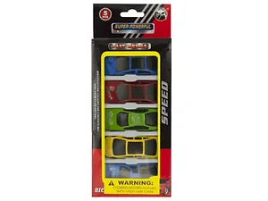 Kids will play for hours with this 5-piece Die Cast Metal Race Cars Set featuring realistic, colorful metal and plastic cars in a variety of styles with free-wheeling action. Just push and go! For ages 3 and up. Comes packaged in a hanging box. Box measures approximately 3.625" x 0.75" x 8.625".