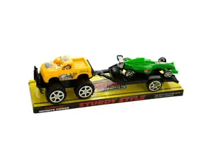 Get ready for an exciting race with the Friction-Powered Off Road Truck and Race Car Set. This dynamic duo features a robust truck with oversized tires designed for rugged adventures, along with a sleek race car that fits perfectly on the trailer. Simply push the truck to activate the friction mechanism and watch it speed away - no batteries needed!
