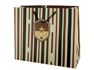 This Stylish Striped Large Gift Bag is perfect for any occasion. Made from high-quality matte paper, it features a trendy striped pattern and comes with a charming star-designed tag. The bag is equipped with durable black woven nylon handles for easy carrying.