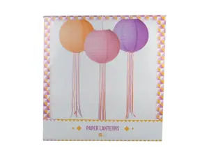 To assemble, simply place the metal insert inside, and secure the lantern using the wire loops at the bottom. This set includes lanterns in cheerful shades of orange, peach, and pink, beautifully packaged in a convenient hanging polybag measuring 13 inches by 13 inches.