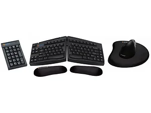 It includes a Goldtouch Adjustable Keyboard, a separate numeric keypad, and your choice of the Evoluent VerticalMouse (available in both right and left-handed versions). Additionally, the package includes a Goldtouch Gel Mouse Platform and individual gel wrist rests to enhance your comfort during long hours at the computer.