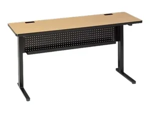 This folding meeting table features a durable mahogany surface paired with a sturdy raven black console frame. Perfect for various settings, including offices, conference rooms, and gatherings. Its compact design allows for easy storage and transportation.