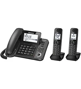 - Link2Cell Bluetooth Corded/Cordless Phone and Answering Machine with 2 Cordless Handsets- Sync up to 2 smartphones to make and receive calls with Link2Cell handsets - Block up to 250 numbers with one-touch Call Block on base unit and handsets - Backlit 3.4" LCD display and keypad on base - Built-in baby monitor - Battery power backup - View and hear email, social media, and other cellphone alerts via Android app - Intelligent Eco Mode - Enhanced Noise Reduction - Frequency: 1.9GHz - Corded or Cordless: Both - Full duplex speakerphone with 7-step volume - Number of Phone Lines: 1 - Bluetooth: Class 1 with up to 330 feet range - Smartphone Connect: No - Handsets Included: 3 - Maximum Number of Handsets: 6 - Digital answering system with up to 18 minutes recording time - Message Waiting Indicator: Auditory and visual - Handset LCD Display:1.8" 103x65 pixel FullDot monochrome - Display Languages: English, Spanish - Amber backlit keypad - Talking Caller ID - Phonebook Entries: up to 3,000 - Accessory Handset: TGFA30 -Headset Jack: 2.5mm, Bluetooth-compatible - Battery Type: 2 rechargeable nickel metal-hydride AAA batteries (HHR-4DPA) - Talk/Standby Time (hours): 13/288 - Charge Time (hours): 7 - Hold - Mute - Conference calling - Call waiting - Tone equalizer - Wall-mountable - Package Includes: 1 corded handset, 2 cordless handsets, 1 AC adapter, 1 telephone line cord, 1 desk stand/wall-mounting adapter, 1 corded handset cord, 4 rechargeable batteries, 2 handset covers, 2 belt clips, and 2 chargers