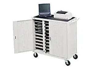 The 30-Notebook Storage Cart is a robust solution designed to securely store and charge up to 30 notebook computers. Built with durable steel, this fully welded unit is ready to use right out of the box. The top shelf provides ample space for additional devices like printers or wireless equipment, while the efficient design ensures that all devices are properly ventilated.