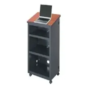 This mobile lectern combines functionality and style, featuring a sleek black finish with cherry accents. It is designed for easy movement and provides ample storage space, making it perfect for presentations and meetings.