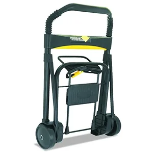 Folding cart features a locking telescopic handle that extends to 39". Ball-bearing rubber wheels absorb impact and roll smoothly. Safety locking straps keeps cargo secure on the 11" x 13-1/4" platform. Folding cart also offers strong steel and aluminum reinforced tubular structure. Collapse the cart with a simple push-button release. Capacity is 200 lb. Cart weighs 6 lb.