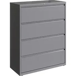 42" wide lateral file features four versatile drawers with hanging file rails for side-to-side filing in letter-size, legal-size or A4-size. Each drawer has a magnetic label holder for easy identification where you need it. Design also features a core-removable lock for security, dual locking bars, full-width pull, ball-bearing slide suspension for smooth opening and closing, reinforced base, and four adjustable leveling guides for stabilization. Interlock system prohibits the extension of more than one drawer at a time for your safety. Counterweight prevents tipping. Lateral file meets or exceeds applicable ANSI/BIFMA standards.